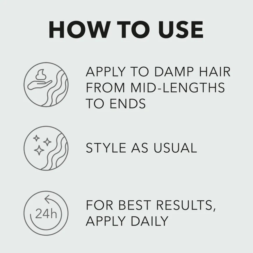 - Påføres i fuktig hår fra lengder til spisser.