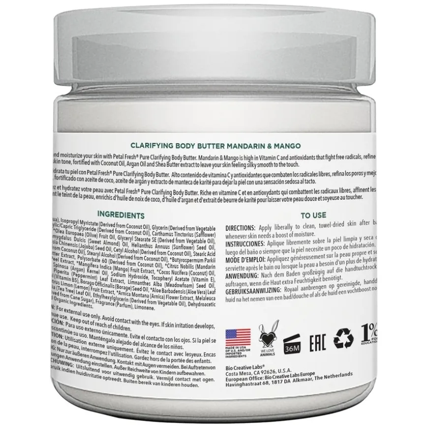 Water (Aqua), Isopropyl Myristate (Derived from Coconut Oil), Glycerin (Derived from Vegetable Oil), Caprylic/Capric Triglyceride (Derived from Coconut Oil), Carthamus Tinctorius (Safflower) Seed Oil, *Olea Europaea (Olive) Fruit Oil, Glyceryl Stearate SE (Derived from Vegetable Oil), Prunus Amygdalus Dulcis (Sweet Almond) Oil, Helianthus Annuus (Sunflower) Seed Oil, Simmondsia Chinensis (Jojoba) Seed Oil, Cetyl Alcohol (Derived from Coconut Oil), Stearic Acid (Derived from Coconut Oil), Stearyl Alcohol (Derived from Coconut Oil), *Butyrospermum Parkii (Shea) Butter Extract, Polysorbate 60 (Derived from Coconut Oil), *Citrus Nobilis (Mandarin Orange) Peel Extract, *Mangifera Indica (Mango) Fruit Extract, *Cocos Nucifera (Coconut) Oil, *Argania Spinosa (Argan) Kernel Oil, Sodium Hydroxide, Tocopheryl Acetate (Vitamin E), *Mentha Piperita (Peppermint) Leaf Extract, Limnanthes Alba (Meadowfoam) Seed Oil, Panthenol (Vitamin B5), Borago Officinalis (Borage) Seed Oil, *Aloe Barbadensis (Aloe Vera) Leaf Juice, *Citrus Limon (Lemon) Fruit Extract, *Arnica Montana (Arnica) Flower Extract, Melaleuca Alternifolia (Tea Tree) Leaf Oil, Ethylhexylglycerin (Derived from Vegetable Oil), Dehydroacetic Acid (Derived from Cane Sugar), Fragrance (Parfum), Limonene.*Certified Organic Ingredients.