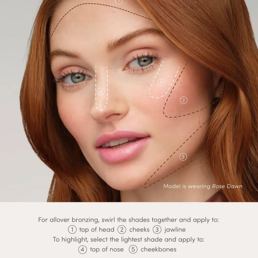 PureBronze™ Shimmer Bronzer Palette Refill Rose Dawn er et multifunksjonelt makeup-produkt med fire nyanser som kan brukes som bronzer, highlighter, blush og øyenskygge. Den glødgivende formelen gir en naturlig finish og kan enten blandes sammen eller brukes hver for seg. Formelen er vegansk, cruelty-free og fri for syntetisk duft. Beriket med pleiende ingredienser som furubarkekstrakt, granatepleekstrakt og solsikkefrøolje, som roer ned huden, beskytter mot frie radikaler og bevarer fuktigheten.