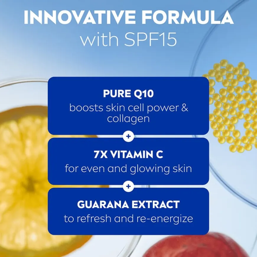 Q10 Energy Healthy Glow Day Cream er en dagkrem med en lett og forfriskende konsistens som raskt absorberes av huden og gir en sunn glød. Med en mild og frisk duft av sitrus. Beriket med ren Q10, vitamin C og guaranaekstrakt. Q10 øker kraften i hudcellene slik at de kan fungere effektivt, samt korrigerer rynker innenfra (testet på hudceller). 7X vitamin C (sammenlignet med en sitron): effektiv konsentrasjon som gir en jevn og strålende hud. Guaranaekstrakt er kjent for å være forfriskende og energigivende. Dagkremen inneholder også SPF15 og beskytter huden mot UVA/UVB-stråler, som forårsaker for tidlig aldring av huden. Dagkremen er dermatologisk testet og er velegnet til matt og sliten hud. Unngå direkte kontakt med øynene.