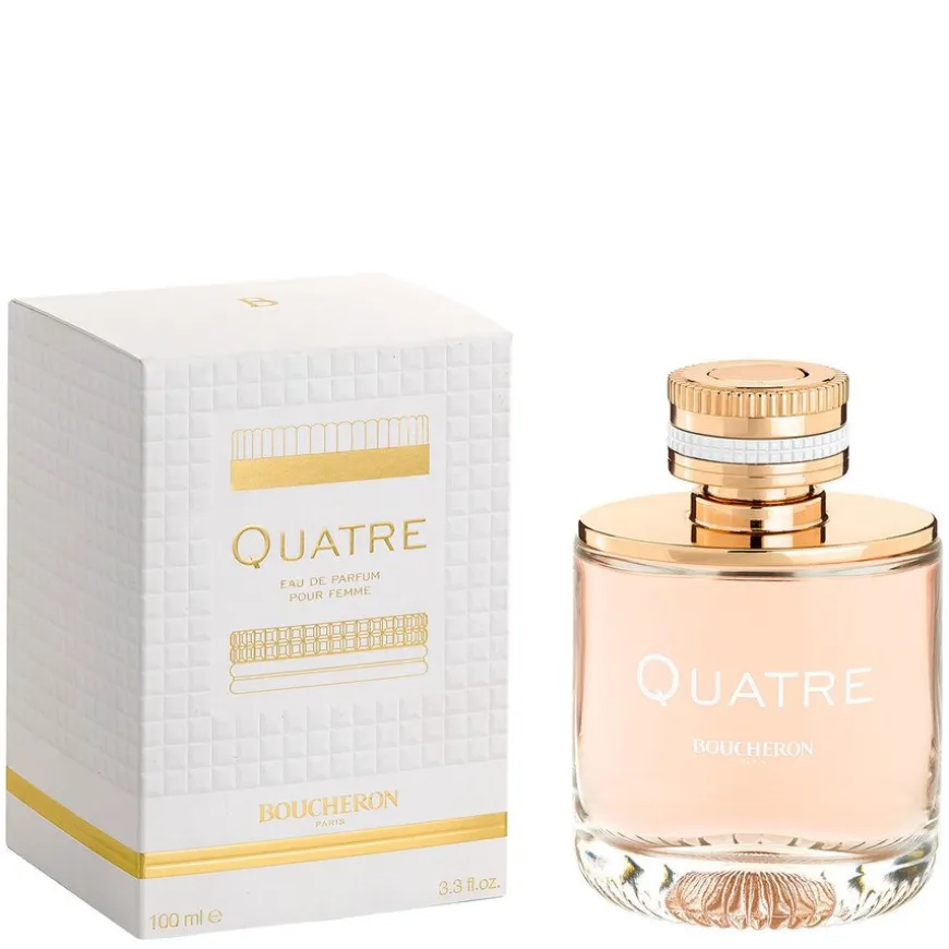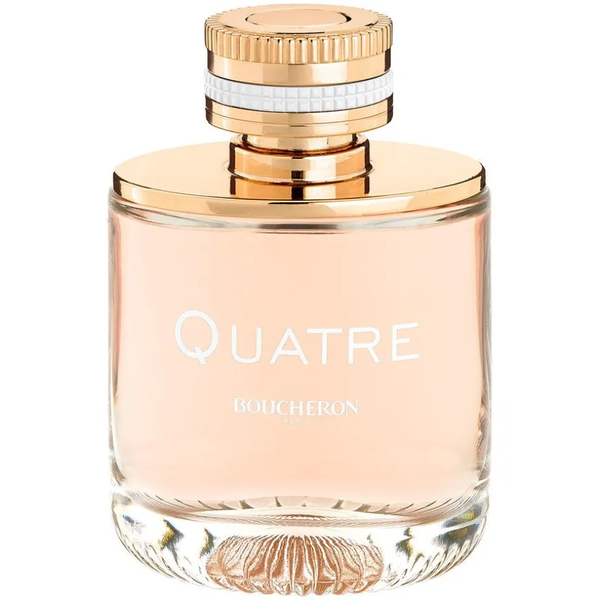 Boucheron Quatre Femme Eau de Parfum åpner friskt med grønn mandarin og bitter appelsin, samtidig som røde bær og villjordbær overrasker med deres deilige fruktige noter. Hjertenotene er fylt med sensualitet fra rose og jasmin. Gyldne trenoter og sedertre gir duften en struktur, mens mykheten av cashmere avslører en dyp sensuell duftsti når den blandes med musk.