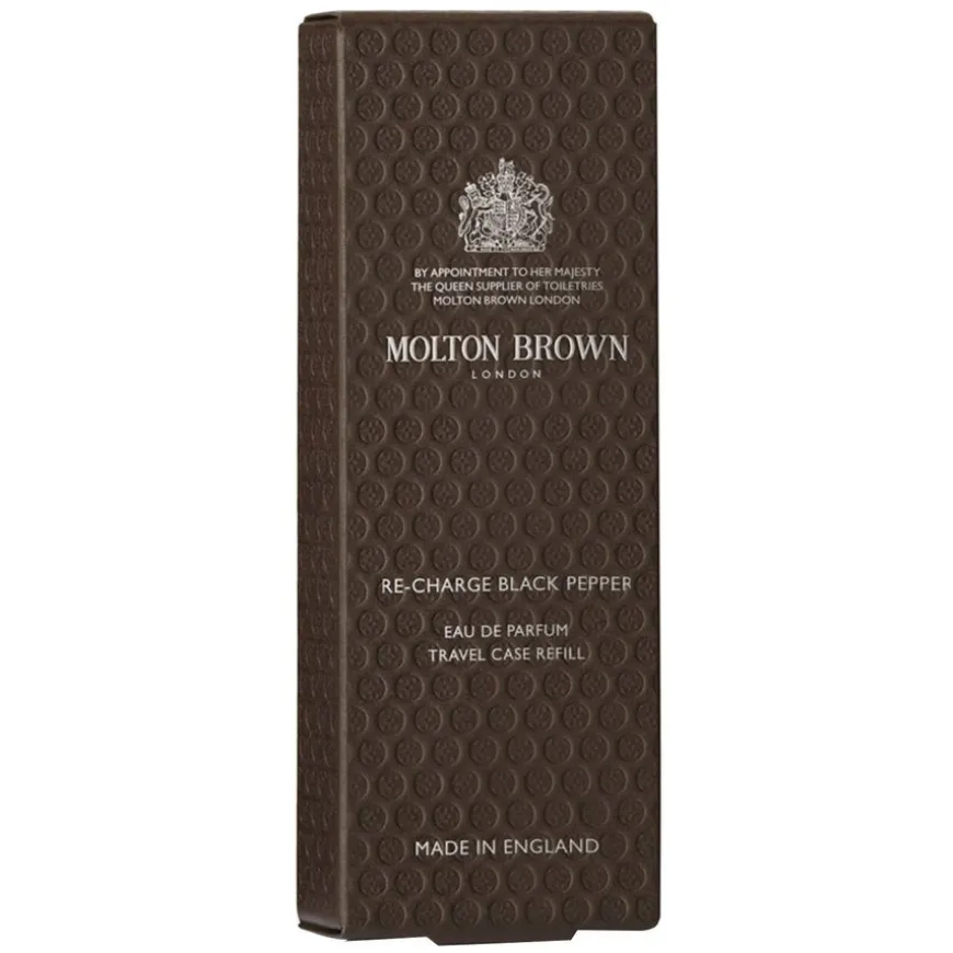 Re-Charge Black Pepper Eau De Parfum Travel Case Refill er en ikonisk duft som kombinerer krydrede noter med frisk bergamott og den unike signaturen av myrtepepper. Denne Eau de Parfum åpner med hypnotisk kardemomme, bergamott, koriander og lavandin, før den utvikler seg til et hjerte av sort pepper, rosépepper, amber og sedertre. Duftens bunn er robust med sedertre, eikemose, lær og vetiver. Perfekt for å omfavne eventyret med en intens, krydret aroma.