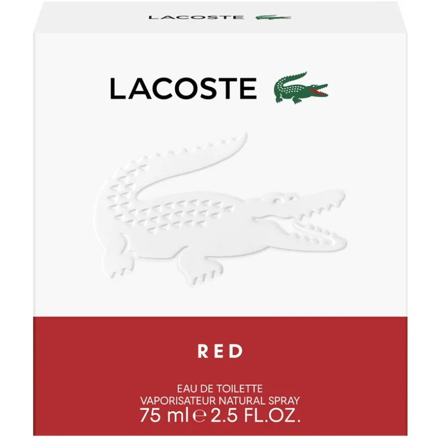 Red Eau de Toilette er en duft full av energi og utholdenhet. Føl den syrlige friskheten til grønt epler i kontrast til komforten til furu- og patchoulinoter før du avslører den elegante maskuline trebaserte basen til denne fruktige duften for dynamiske menn. Dens moderne og elegante flaske fremhever de ikoniske kodene til merket med krokodilleemblemet inngravert i glasset. Den ytre pakningen og hetten på duften har en iøynefallende rødfarge for å representere energien til duften og dens brukere.