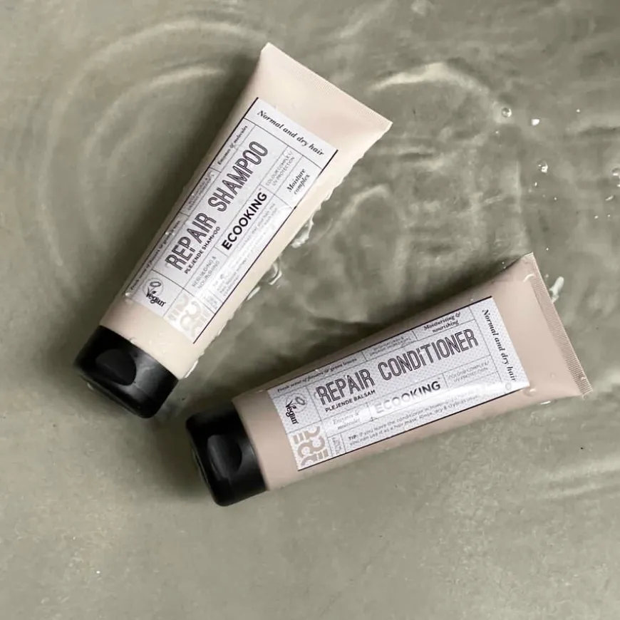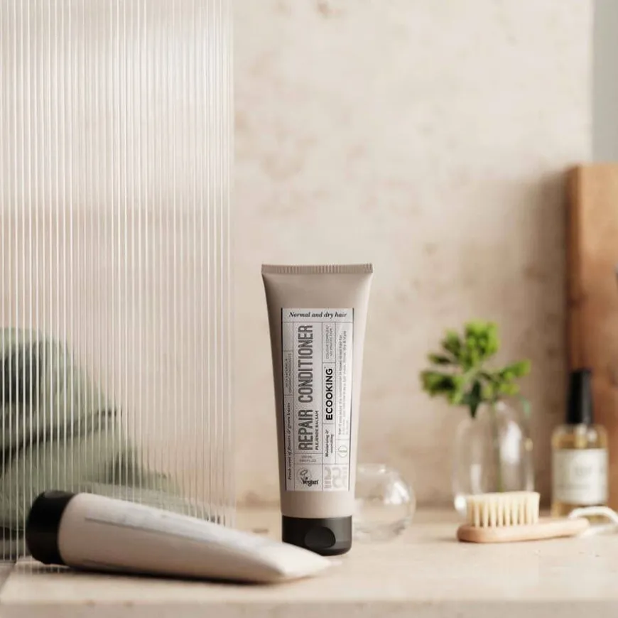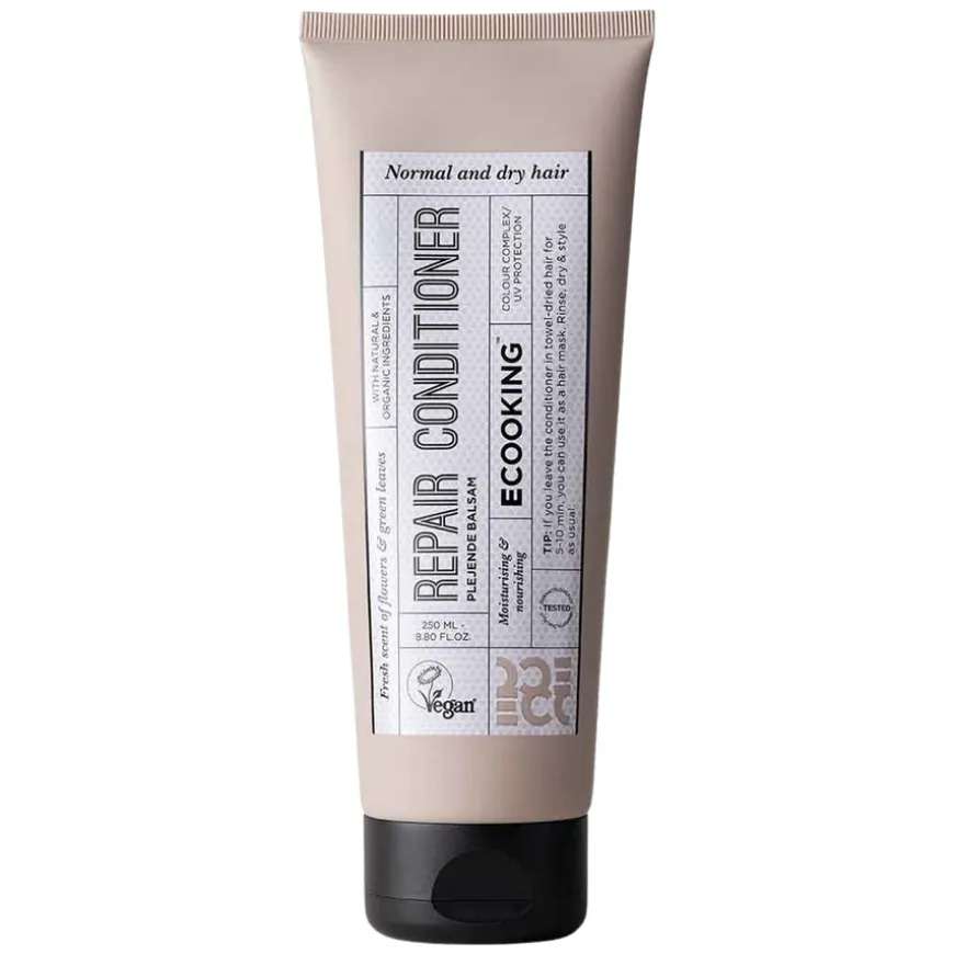 Repair Conditioner er en balsam til normalt og tørt hår med en frisk duft af blomster og grønne blade. ECOOKING sin nye Repair Conditioner fugter og giver næring til tørt hår. Repair Conditioner indeholder et fugtighedsgivende kompleks, som giver håret tråde med fugtighed i op til 72 timer, samtidig som den har en plejende som styrker håret og gør det silkeblødt. Yderligere indeholder den et farvekompleks samt UVA- og forureningsbeskyttelse, som beskytter håret og hårfarven, både naturligt og farvet hår, mod sol, vand, luft og forurening m.m.