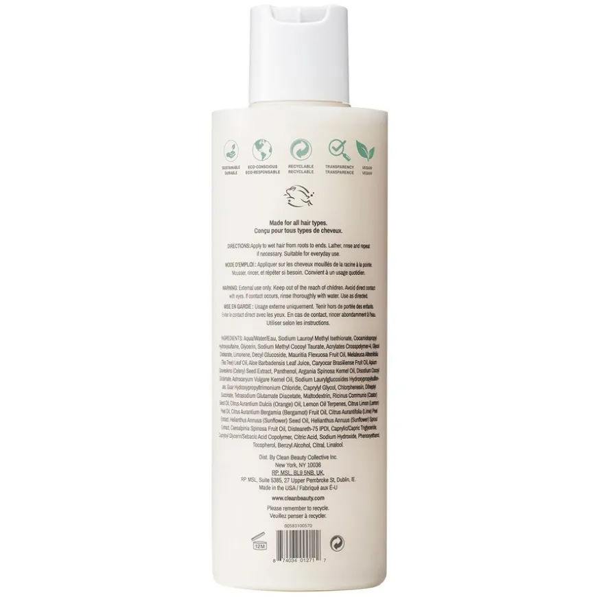 Aqua/Water/Eau, Sodium Lauroyl Methyl Isethionate, Cocamidopropyl Hydroxysultaine, Glycerin, Sodium Methyl Cocoyl Taurate, Acrylates Crosspolymer-4, Glycol Distearate, Limonene, Decyl Glucoside, Mauritia Flexuosa Fruit Oil, Melaleuca Alternifolia (Tea Tree) Leaf Oil, Aloe Barbadensis Leaf Juice, Caryocar Brasiliense Fruit Oil, Apium Graveolens (Celery) Seed Extract, Panthenol, Argania Spinosa Kernel Oil, Disodium Cocoyl Glutamate, Astrocaryum Vulgare Kernel Oil, Sodium Laurylglucosides Hydroxypropylsulfonate, Guar Hydroxypropyltrimonium Chloride, Caprylyl Glycol, Chlorphenesin, Diheptyl Succinate, Tetrasodium Glutamate Diacetate, Maltodextrin, Ricinus Communis (Castor) Seed Oil, Citrus Aurantium Dulcis (Orange) Oil, Lemon Oil Terpenes, Citrus Limon (Lemon) Peel Oil, Citrus Aurantium Bergamia (Bergamot) Fruit Oil, Citrus Aurantifolia (Lime) Peel Extract, Helianthus Annuus (Sunflower) Seed Oil, Helianthus Annuus (Sunflower) Sprout Extract, Caesalpinia Spinosa Fruit Oil, Disteareth-75 IPDI, Caprylic/Capric Triglyceride, Capryloyl Glycerin/Sebacic Acid Copolymer, Citric Acid, Sodium Hydroxide, Phenoxyethanol, Tocopherol, Benzyl Alcohol, Citral, Linalool.