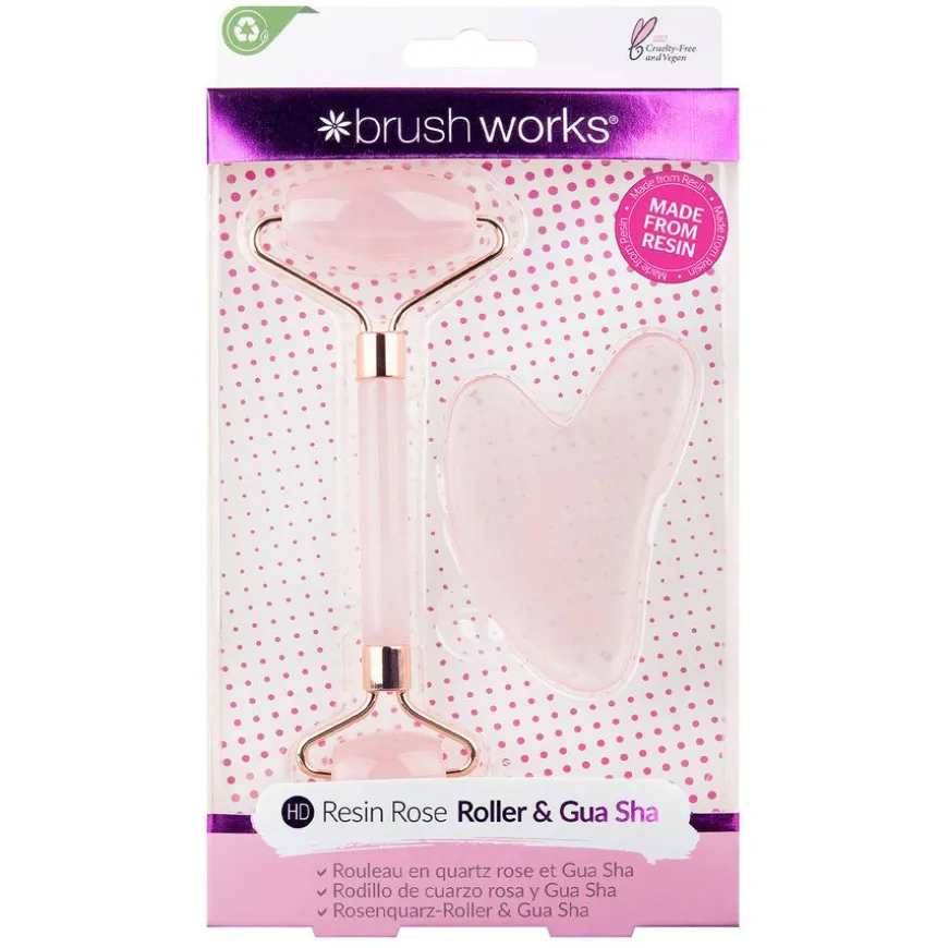 Din velværeøkt er i ferd med å få en oppgradering. Brushworks’ Resin Rose Roller & Gua Sha har to beroligende hudverktøy for å forbedre hudpleierutinen din. Den reduserer oppblåsthet og hjelper til med absorpsjonen av serum og fuktighetskremer. Resin Rose Gua Sha hjelper til med å forbedre hudens elastisitet og fremme hudforyngelse, og Resin Rose Roller brukes til å massere huden og skape en ungdommelig, strålende glød. Produktet er laget av harpiks (resin).