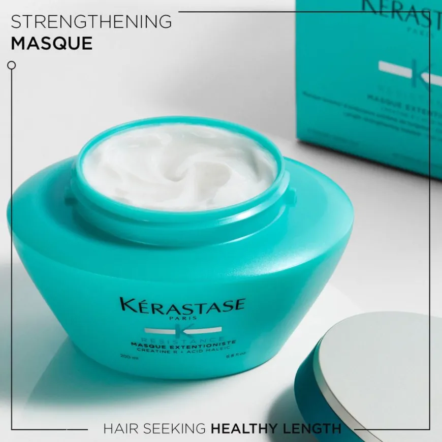 Kérastase Resistance Masque Extentioniste Hair Mask er en styrkende hårmaske som er ideell for dem som søker sterke lengder som ser sunne ut. Skadet, skjørt hår fremstår sterkere og etterlates mykt og glansfullt. Hårmasken er beriket med Creatine R og Maleinsyre, som gjør at håret føles sterkere og risikoen for at håret knekker reduseres. Sørger for et jevnt og skinnende resultat fra rot til tupp.