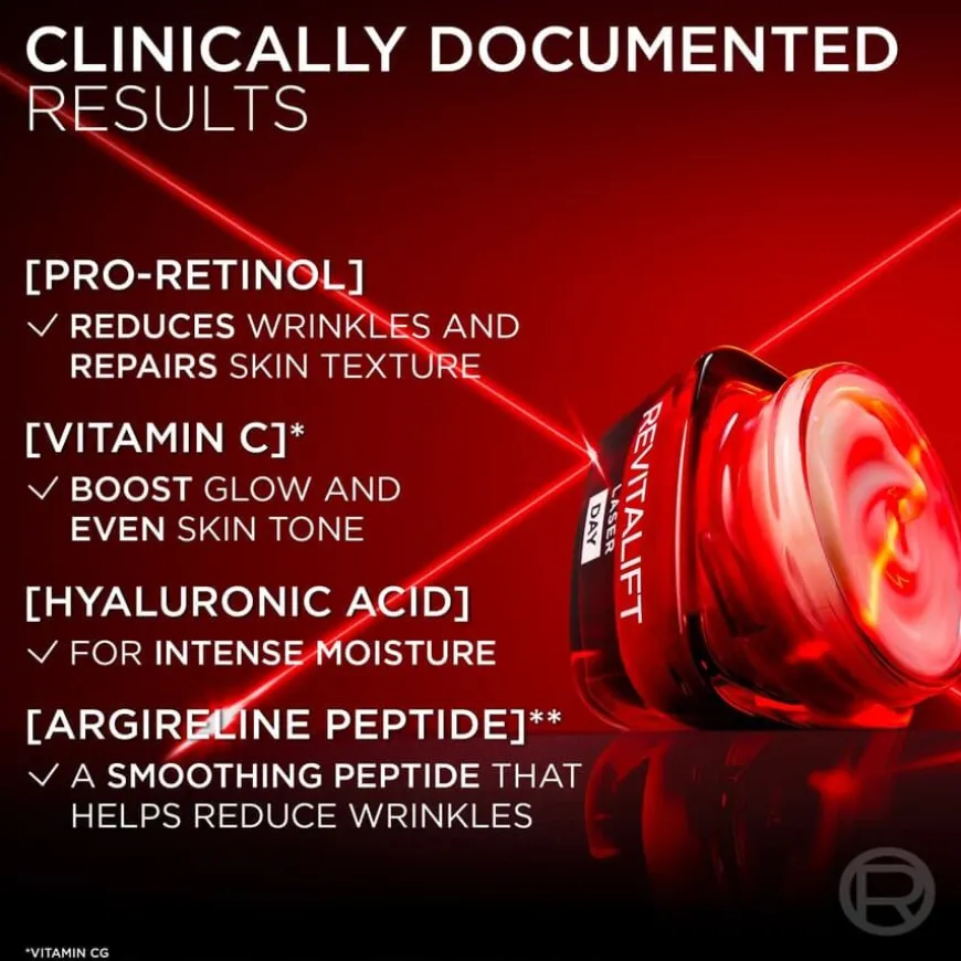 Opplev effekten av L’Oréal Paris Revitalift Laser Day Cream! En oppstrammende og fuktighetsgivende antirynkekrem for hud med aldringstegn. Kremen er beriket med rynkereduserende fragmentert hyaluronsyre og 3 % konsentrert Pro-XylaneTM, en patentert ingrediens som bidrar til å redusere rynker og styrke hudbarrieren. Prøv en anti-age-krem som bidrar til forbedret hudstruktur og lar deg nyte huden din fullt ut, i alle livets faser!