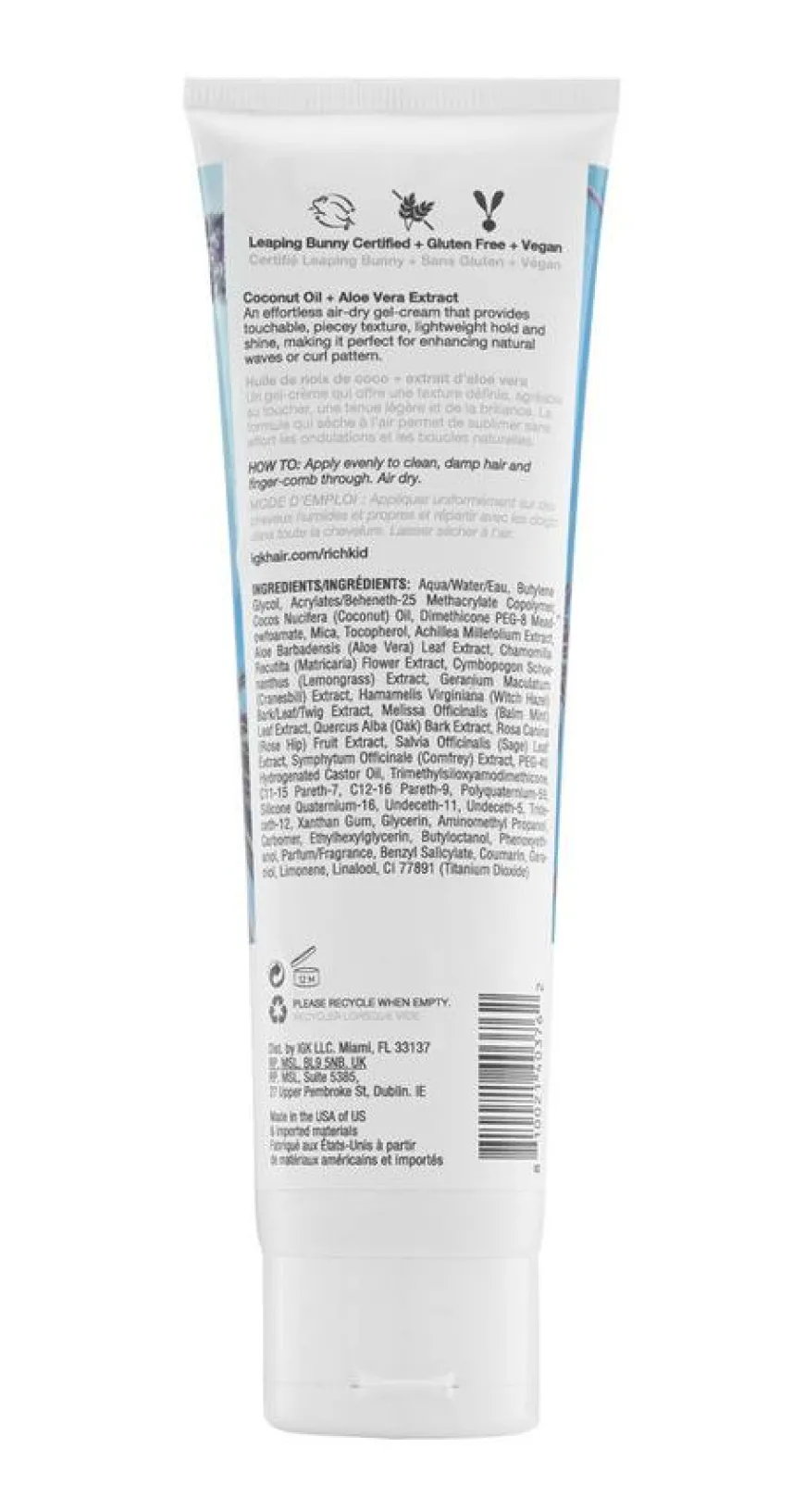 Rich Kid Wave Enhancing Air-Dry Cream er en gelkrem for lufttørking av hår, som gir berørbar, stykkete tekstur, lett hold og glans, noe som gjør den perfekt for å forsterke naturlige bølger eller krøllemønster. UV-beskyttelse. Kokosolje nærer og gir fukt, og aloe vera gir hydrering og myk tekstur. Passer alle hårtyper. Vegansk.
