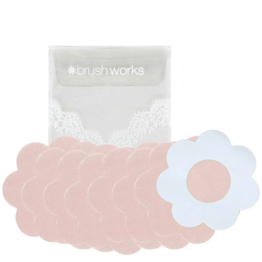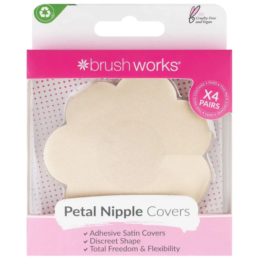 Føl deg trygg i ethvert antrekk med Brushworks Satin Petal Nipple Covers. De selvklebende dekslene er lette, langvarige og lette å påføre, for å skape et glatt og diskret utseende under de tetteste klærne. Inneholder 4 nippeldeksler – kastes etter bruk.