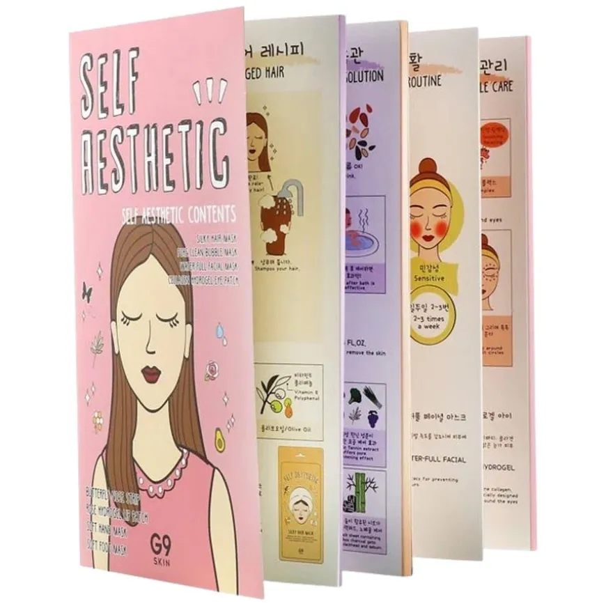 Self Aesthetic Mask Magazine fra G9SKIN er den ultimate self-care pakken som samler 8 ulike masker for ansikt, hår, lepper, hender og føtter – alt du trenger for en fullverdig skjønnhetsbehandling hjemme.