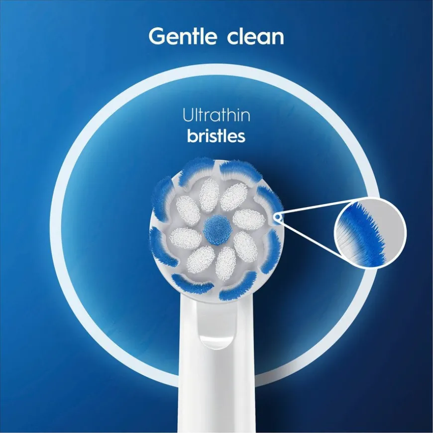 - Oral-B Sensitive Clean har ultratynne børstestrå med høy tetthet for en skånsom og effektiv rengjøring.