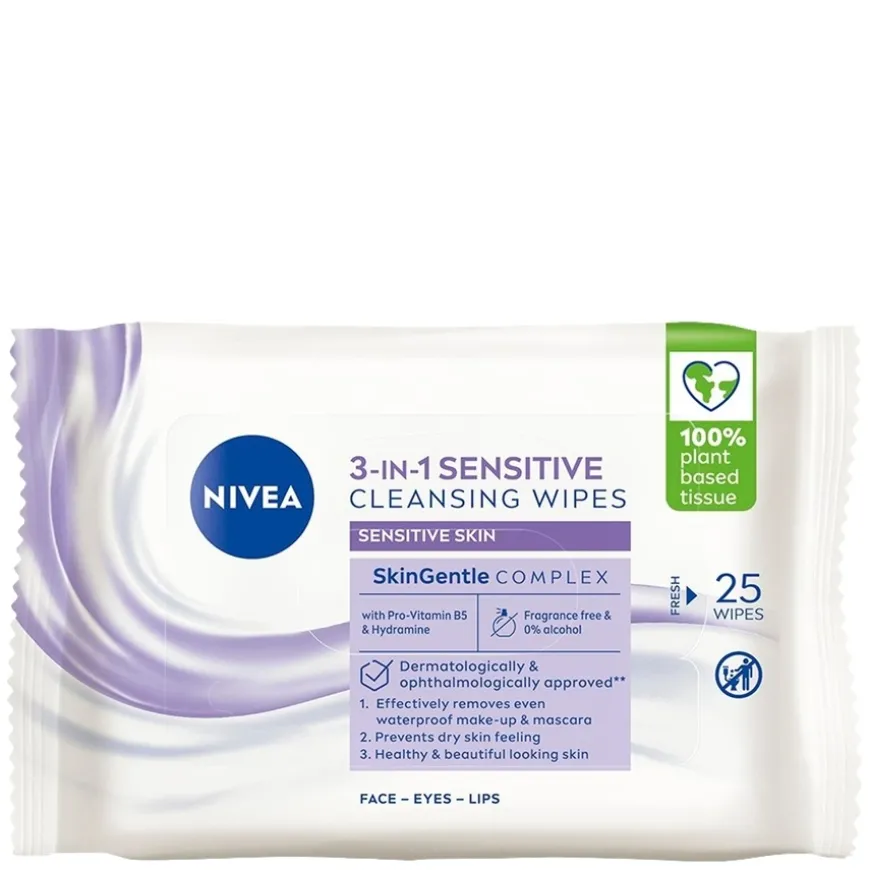 Sensitive Cleansing Wipes: Ansiktsservietter for sensitiv hud. Takket være dekspantenol beroliger de huden mens de fjerner vannfast sminke og maskara. Disse våtserviettene er parfymefrie og uten alkohol. Egnet til følsom hud.