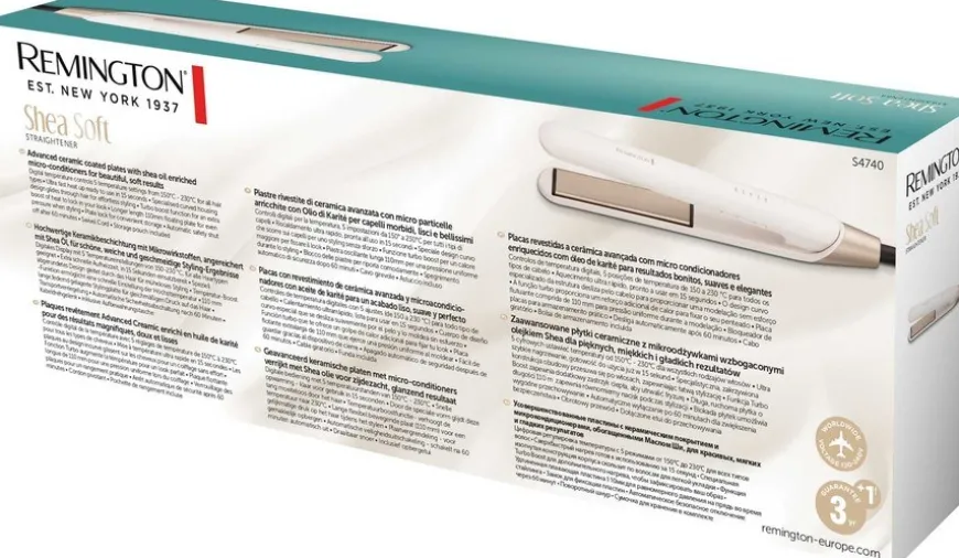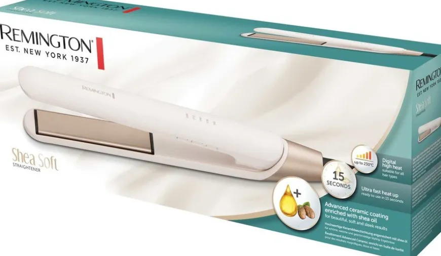 Remington Shea Soft Straightener er en rettetang med avansert keramisk belagte 110 mm plater som inneholder mikrobalsam med Shea-olje som gjør håret ditt naturlig mykt og skinnende. Med det digitale displayet kan du enkelt velge den temperaturen som passer håret ditt, velg mellom temperaturer fra 150°C opp til 230°C. Minnefunksjonen husker sist valgte temperatur og har spenningsjustering for hele verden.