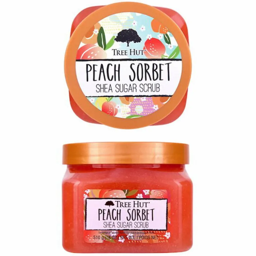 Shea Sugar Scrub Peach Sorbet er en skånsom og næringsgivende sukkerskrubb til kroppen som gir en intensiv eksfoliering for en myk og glansfull hud. Sukkerkornene i skrubben eksfolierer varsomt døde hudceller og tørr hud, så huden bli myk og føyelig. Inneholder blant annet aprikoskjerneolje som gjør huden myk, låser inn fuktighet, forbedrer hudtonen og fremmer en sterk hudbarriere, ferskenekstrakt som balanserer huden, øker hudens glød, beskytter huden mot miljøpåvirkninger og øker hudens celleforandring, sheasmør som fukter i dybden, gir næring, gjør huden myk og fremmer elastisiteten. Skrubben er også beriket med naturlige oljer fra avokado, macadamiafrø, nattlys, søtmandel, aprikoskjerner, saflor og appelsin. Den har en søt og fruktig duft av aprikos og fersken. Vegansk.