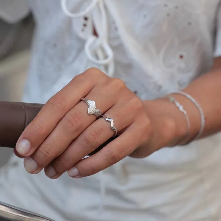 Silke x Sistie ringen i sterlingsølv er designet med en glatt, bølgete overgang som symboliserer havets opp- og nedturer, en refleksjon av livet slik Silke Kristensen beskriver det.