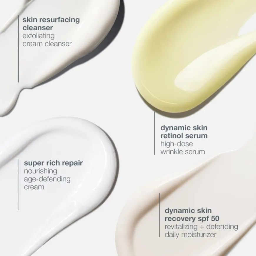 super rich repair: Water/Aqua/Eau, Isohexadecane, Dipropylene Glycol, Caprylic/Capric/Myristic/Stearic Triglyceride, Lauryl PEG-9 Polydimethylsiloxyethyl Dimethicone, Simmondsia Chinensis (Jojoba) Seed Oil, Butyrospermum Parkii (Shea) Butter, Dimethicone, Glycerin, Octyldodecyl Neopentanoate, Sodium Chloride, Isostearic Acid, Arginine/Lysine Polypeptide, Palmitoyl Tripeptide-5, Avena Sativa (Oat) Kernel Extract, Pyrus Malus (Apple) Seed Extract, Borago Officinalis Seed Oil, Oenothera Biennis (Evening Primrose) Oil, Hydrogenated Coconut Oil, Gardenia Taitensis Flower, Laminaria Digitata Extract, Yeast Extract, Glucosamine HCL, Cedrus Atlantica Bark Oil, Cupressus Sempervirens Leaf/Stem Extract, Eucalyptus Globulus Leaf Oil, Helianthus Annuus (Sunflower) Seed Oil, Pelargonium Graveolens Flower Oil, Aniba Rosodora (Rosewood) Wood Oil, Abies Sibirica Oil, Santalum Album (Sandalwood) Oil, Sodium Hyaluronate, Tocopheryl Acetate, Colloidal Oatmeal, Madecassoside, Urea, Hexyldecanol, Polyglyceryl-4 Isostearate, Cetyl Dimethicone, Hydrogenated Castor Oil, Butylene Glycol, Caprylyl Glycol, Ethylhexylglycerin, Hexylene Glycol, Linalool, Geraniol, Citronellol, Phenoxyethanol.dynamic skin recovery spf50: Water/Aqua/Eau, Octocrylene, Carthamus Tinctorius (Safflower) Oleosomes, Butylene Glycol, Homosalate, Dimethicone, Butyl Methoxydibenzoylmethane, Ethylhexyl Salicylate, C12-15 Alkyl Benzoate, Propanediol, Polysorbate 80, Palmitoyl Tetrapeptide-7, Dipotassium Glycyrrhizate, Aniba Rosodora (Rosewood) Wood Oil, Camellia Sinensis Leaf Extract, Pelargonium Graveolens Flower Oil, Eugenia Caryophyllus (Clove) Leaf Oil, Laminaria Digitata Extract, Saccharomyces Cerevisiae Extract, Rosa Damascena Flower Oil, Eugenia Caryophyllus (Clove) Bud Oil, Citrus Limon (Lemon) Peel Oil, Cupressus Sempervirens Leaf Oil, Cymbopogon Martini Oil, Cymbopogon Schoenanthus Oil, Citrus Limon (Lemon) Peel Extract, Eucalyptus Globulus Leaf Oil, Helianthus Annuus (Sunflower) Seed Oil, Tocopherol, Squalane, Caprylyl Glycol, Acrylates/C10-30 Alkyl Acrylate Crosspolymer, Carnosine, Lecithin, Urea, Caprylic/Capric Triglyceride, Glycerin, Pentylene Glycol, Bisabolol, Glucosamine HCl, Ethylhexylglycerin, 1,2-Hexanediol, Titanium Dioxide, Gluconolactone, Polysorbate 60, Trisodium Ethylenediamine Disuccinate, Sorbitan Isostearate, Decyl Glucoside, Aminomethyl Propanol, Hydroxyethyl Acrylate/Sodium Acryloyldimethyl Taurate Copolymer, Polysilicone-11, Sodium Acrylates Copolymer, Phenethyl Alcohol, Sodium Benzoate, Linalool, Eugenol, Limonene, Citronellol, Geraniol, Benzyl Benzoate, Citral.dynamic skin retinol serum: Water/Aqua/Eau, Squalane, Glycerin, Hexyldecanol, Propanediol, Dimethyl Isosorbide, Hydroxyethyl Acrylate/Sodium Acryloyldimethyl Taurate Copolymer, Hydroxyacetophenone, Hydroxypinacolone Retinoate, Retinol, Helianthus Annuus (Sunflower) Seed Oil, Rosmarinus Officinalis (Rosemary) Leaf Extract, Pelargonium Graveolens Flower Oil, Aniba Rosodora (Rosewood) Wood Oil, Eucalyptus Globulus Leaf Oil, Santalum Album (Sandalwood) Oil, Oryza Sativa (Rice) Bran Extract, Helianthus Annuus (Sunflower) Extract, Cupressus Sempervirens Oil, Juniperus Virginiana Oil, Abies Sibirica Oil, Tocopherol, Beta-Glucan, Caprylyl Glycol, BHT, Ceramide NP, Caprylic/Capric Triglyceride, Cetyl Palmitate, 1,2-Hexanediol, Ethylhexylglycerin, Polysorbate 60, Tetrasodium Glutamate Diacetate, Hydroxystearic Acid, Polysorbate 20, Sorbitan Isostearate, Laureth-23, Trideceth-6 Phosphate, Sodium Hydroxide, Citric Acid, Polyacrylate Crosspolymer-6, Sodium Benzoate, Benzyl Alcohol, Linalool.skin resurfacing cleanser: Water/Aqua/Eau, Sodium C14-16 Olefin Sulfonate, Lactic Acid, PPG-2 Hydroxyethyl Cocamide, Sodium Cocoamphoacetate, Acrylates/Dimethylaminoethyl Methacrylate Copolymer, Glycol Distearate, Propanediol, Helianthus Annuus (Sunflower) Seed Oil, Aniba Rosodora (Rosewood) Wood Oil, Pelargonium Graveolens Flower Oil, Eugenia Caryophyllus (Clove) Leaf Oil, Rosa Damascena Flower Oil, Eugenia Caryophyllus (Clove) Bud Oil, Citrus Limon (Lemon) Peel Oil, Cymbopogon Schoenanthus Oil, Cymbopogon Martini Oil, Cupressus Sempervirens Leaf Oil, Citrus Limon (Lemon) Peel Extract, Eucalyptus Globulus Leaf Oil, Tocopheryl Acetate, Tocopherol, Titanium Dioxide (CI 77891), Cocamidopropyl Hydroxysultaine, Pentylene Glycol, Caprylyl Glycol, Caprylic/Capric Triglyceride, Ethylhexylglycerin, Tetrasodium Glutamate Diacetate, Sodium Hydroxide, Citric Acid, Benzalkonium Chloride, Linalool, Eugenol, Limonene, Citronellol, Geraniol.