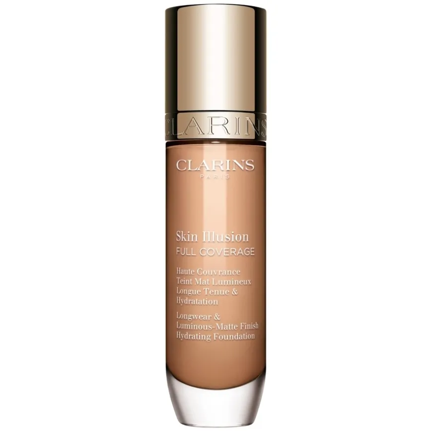 Skin Illusion Full Coverage Foundation fra Clarins gir en perfekt, silkemyk hudtone med høy dekkevne som varer i opptil 24 timer. Den innovative Skin Fit Technology-formelen er motstandsdyktig mot svette, fukt og bevegelser, slik at hudtonen forblir jevn hele dagen. Den lette, fleksible teksturen smelter naturlig inn i huden uten å skape en «maskeeffekt», samtidig som den lar huden puste.