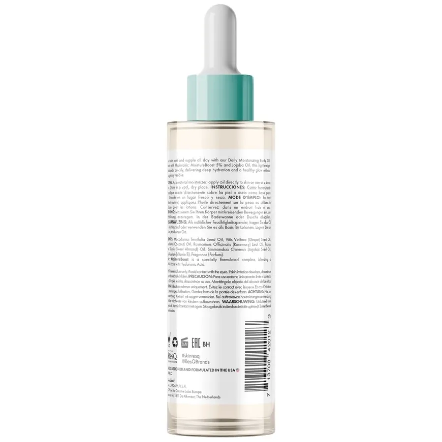 Skin ResQ Daily Moisturizing Body Oil er en fuktighetsgivende kroppsolje som tilfører intensiv næring til tørr og gusten hud. Den lette, hurtigabsorberende formelen inneholder 5 % Hyaluronic MoistureBoost og jojobaolje som balanserer hudens fuktighetsnivå og gir silkemyk finish. I tillegg bidrar macadamia- og druefrøolje til å styrke hudbarrieren og forbedre elastisiteten. Oljen er ideell for daglig bruk og passer perfekt til tørre partier som albuer, knær og hæler. Passer for alle hudtyper, også sensitiv hud.