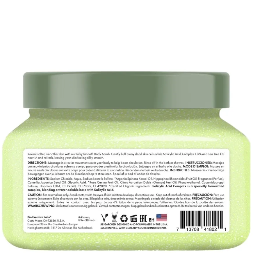 Skin ResQ Silky Smooth Body Scrub er en effektiv kroppsskrubb som gir en glattere hudtekstur og bidrar til klarere hud. Den er formulert med 1,5 % salisylsyre som eksfolierer skånsomt, fornyer hudens overflate og forbedrer utseendet til porene. I tillegg virker tea tree-olje rensende og beroligende, noe som hjelper til med å redusere og forebygge urenheter. Resultatet er en friskere, jevnere og mer strålende hud. Passer for alle hudtyper, spesielt kombinert og fet hud.