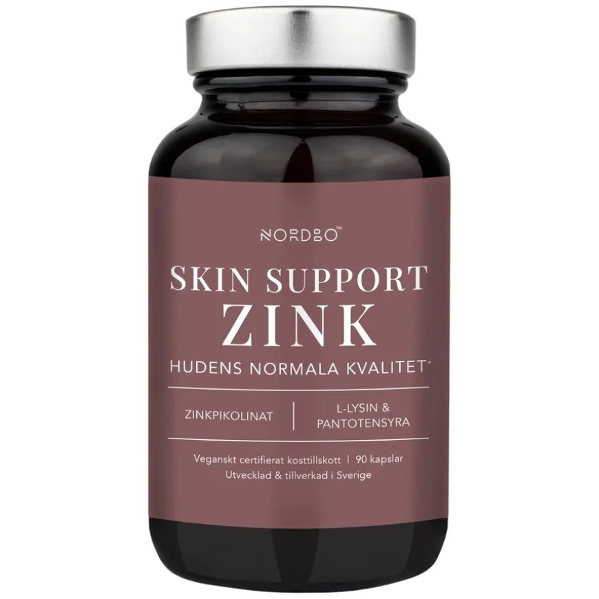 Omtrent 20 % av all sink i kroppen finnes i huden, og sink er nødvendig blant annet for hudens heling. Skin Support Zink inneholder sinkpikolinat, som betyr at sink er bundet til pikolinsyre (kalt kelatering) for optimal opptak. Sink bidrar til hudens normale kvalitet og funksjon, samt til redusert oksidativt stress i cellene og cellefornyelse.