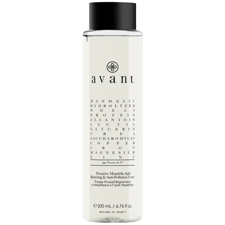 Avant Proactive Mandelic Acid Restoring & Anti-Pollution Toner jobber for å skånsomt eksfoliere, friske opp og stimulere tørr og tilstoppet hud. Denne toneren fjerner de siste restene av sminke og rens, og bidrar til å fjerne alle urenheter fra huden samtidig som den forbedrer hudtonen, strammer porene og umiddelbart gjenoppretter huden etter rens.