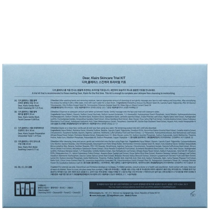 Skincare Trial Kit er en fin introduksjon til Klairs eller for de som ønsker å kjøpe Klairs til når de skal ut å reise. Dette settet er nok til å fullføre hudpleierutine, fra rensing til fuktighetsgivende pleie.