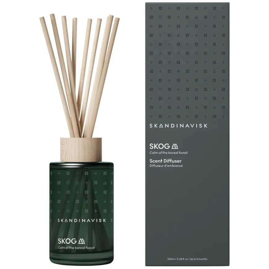 Skandinavisk SKOG Scent Diffuser kombinerer skandinaviske duftfortellinger med vegetabilske oljer fra fornybare kilder, fylt i en malt glassvase. Den har en dekorativ FSC-sertifisert bøketre-ring og åtte høyytelsespinner, som gir en skånsom og bærekraftig romduft i opptil 3 måneder.