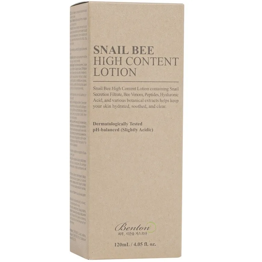 Snail Bee High Content Lotion er en pleiende, reparasjons- og mykgjørende lotion som i stedet for vann er basert på snegleslim og en høy konsentrasjon av biegift som sammen virker for å starte hudens egen helingsprosess og stimulere produksjonen av kollagen og elastin. Denne lotionen er en lettere variant av Bentons Steam Cream og passer for alle aldre og hudtyper, spesielt fet hud og kombinert hud. Perfekt også for personer med akneutsatt hud, da snegleslim og biegift effektivt lindrer og forebygger akne.