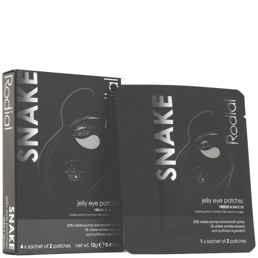 Snake Jelly Eye Patches fra Rodial er kjølende øyemasker i geléform som reduserer synligheten av fine linjer og rynker under øynene. De inneholder 1 % SYN®-AKE Tripeptid, et aktivt peptid som etterligner effekten av ormegift og bidrar til å «fryse» muskelbevegelser for en glattere og mer ungdommelig hud. Patchesene har en unik gelékonsistens som styrker opptaket av de aktive ingrediensene, reduserer hevelser og gir en forfriskende effekt. Beriket med glyserin og et botanisk bladkompleks av persimon, basilikum og kamille for å forbedre hudens elastisitet, smidighet og fuktbalanse. Resultatet er et våkent og ungdommelig utseende. Passer alle hudtyper.