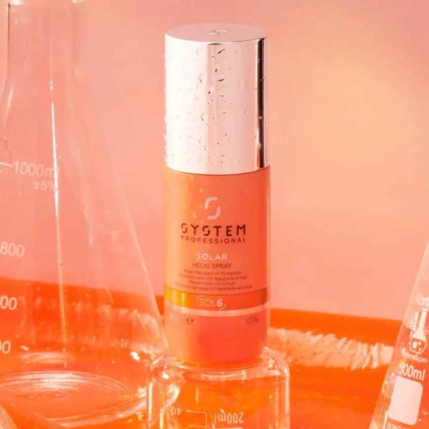 System Professional Solar Helio Guard er en vannfast alt-i-én-spray som beskytter håretmot solskader uten å være klebrig.