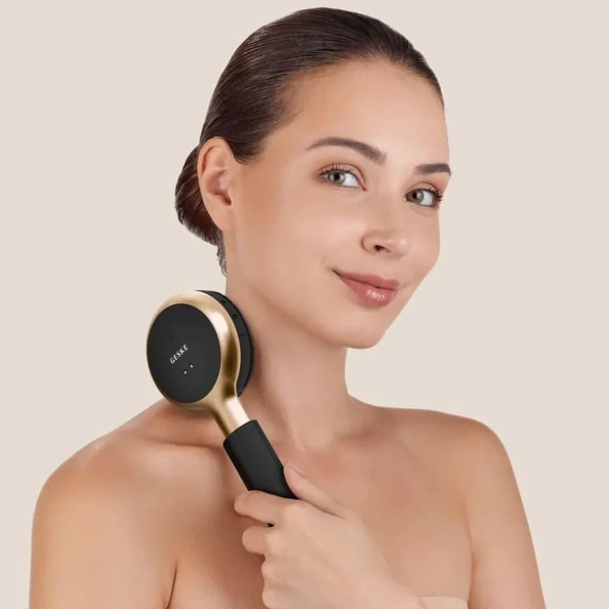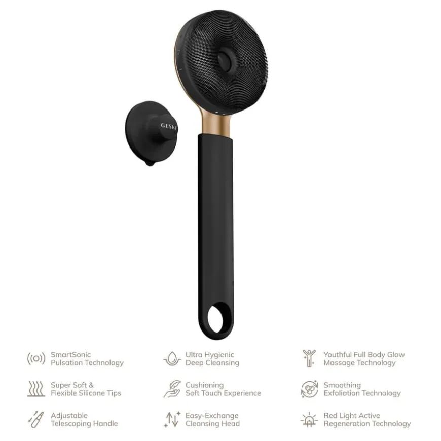 Sonic LED Full-Body Brush 9 In 1 er en innovativ kroppspleiebørste fra GESKE som kombinerer rensing, eksfoliering og anti-age behandling i én avansert enhet. Med SmartSonic Pulsation Technology, rødt LED-lys og en eksfolierende side i tillegg til ultramyke rensebørster, revitaliserer den huden, forbedrer sirkulasjonen og fremmer cellefornyelse. Det uttrekkbare teleskophåndtaket gir tilgang til vanskelig tilgjengelige områder, som ryggen. Resultatet er en hud som føles jevnere, fastere og mer strålende – rett fra dusjen. Enheten kan brukes sammen med GESKE-appen for tilpassede programmer basert på AI-analyse av huden din.