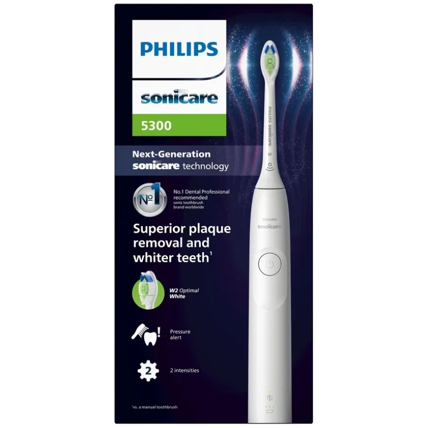 Philips Sonicare 5300 Sonic Electric Toothbrush er en elektrisk tannbørste med neste generasjons sonisk teknologi – for overlegen plakkfjerning og hvitere tenner.* Med et hvitgjørende børstehode, avansert rengjøringsteknologi og innebygd trykkvarsel, får du en effektiv og trygg tannpleierutine. Tannbørsten fjerner opptil sju ganger så mye plakk* og forbedrer tannhygienen din allerede fra første bruk.