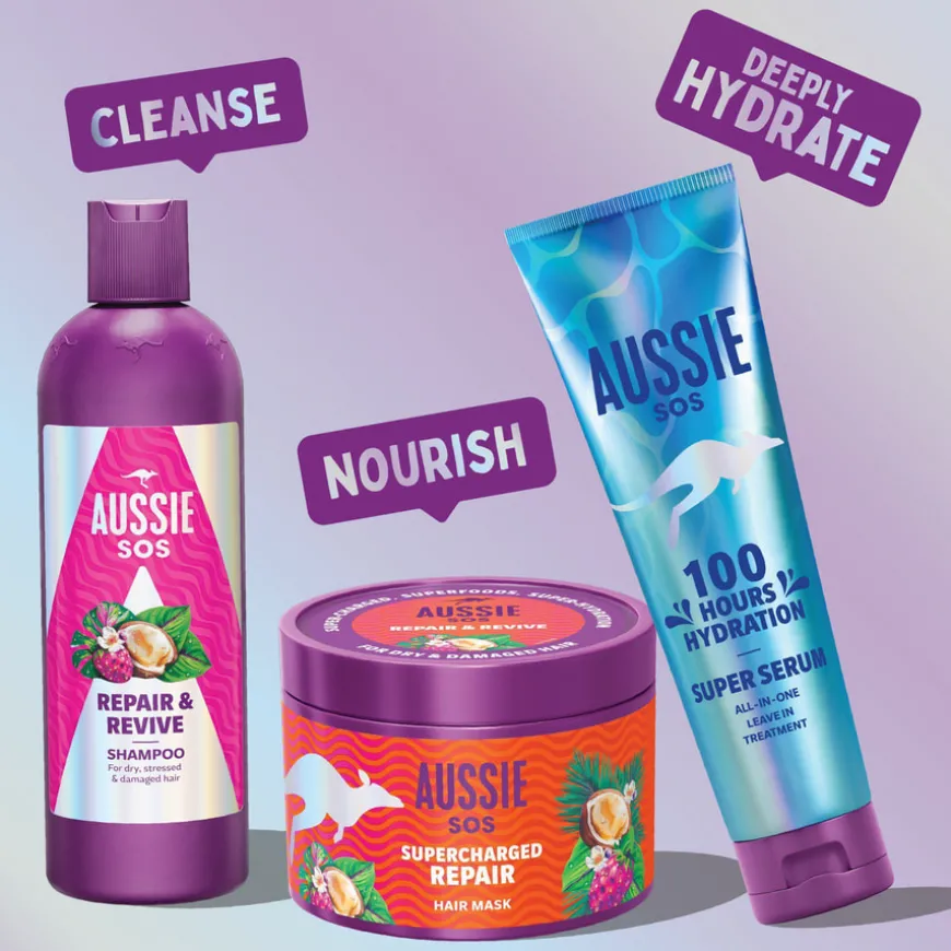 SOS Supercharged Repair Hair Treatment fra Aussie er den ultimate løsningen for tørt og skadet hår som trenger intensiv pleie. Denne vitaliserende hårmasken reparerer og beskytter stresset hår mot fremtidige skader, samtidig som den gir mykhet, glatthet og hydrering i opptil 100 timer. Den veganske formelen inneholder superingredienser fra Australia som gir dyp næring og fuktighet til håret. Bruk som en klassisk maske du skyller ut for intens reparasjon, eller som en leave-in-maske for ekstra pleie og beskyttelse. For optimal hårredning, bruk med andre produkter fra Aussie SOS-serien.