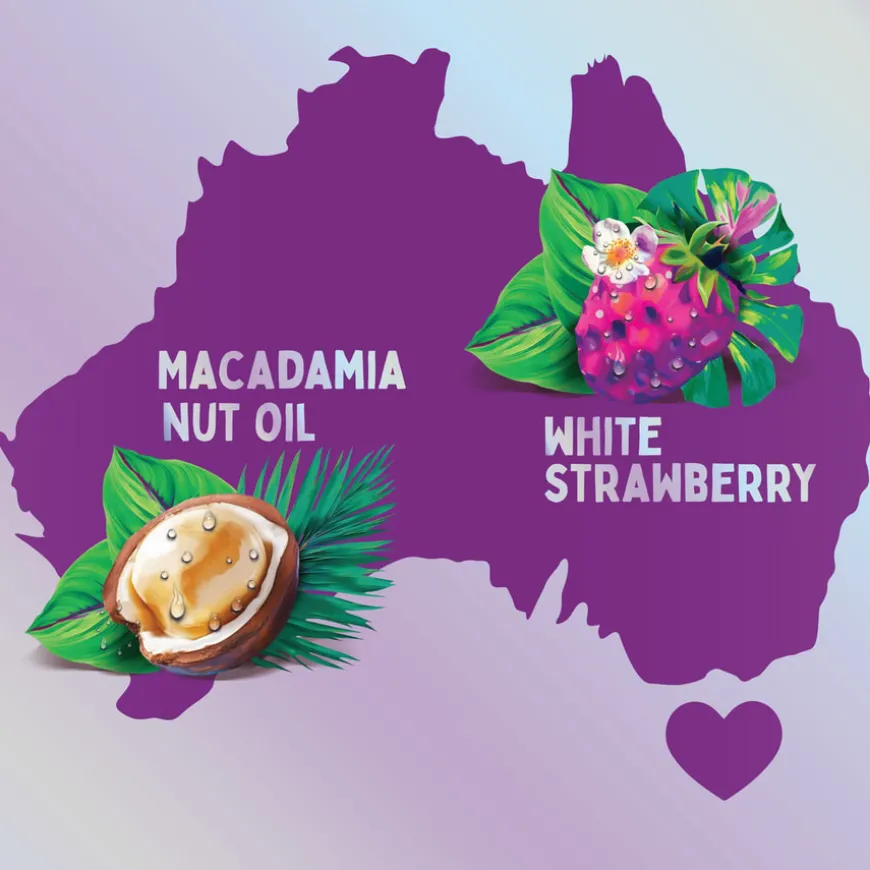 Aqua, Stearyl Alcohol, Bis-Aminopropyl Dimethicone, Behentrimonium Chloride, Cetyl Alcohol, Isopropyl Alcohol, Parfum, Benzyl Alcohol, Sodium Benzoate, Limonene, Disodium EDTA, Citric Acid, Linalool, Polysorbate 20, Macadamia Ternifolia Seed Oil, Histidine, Butylene Glycol, Geraniol, Citral, Fragaria Chiloensis Fruit Extract