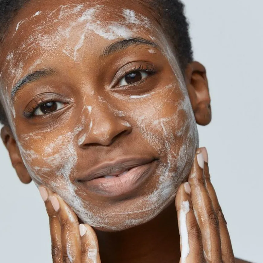 - Skum opp en liten mengde rensegelé mellom fuktede hender og påfør på fuktet hud.
