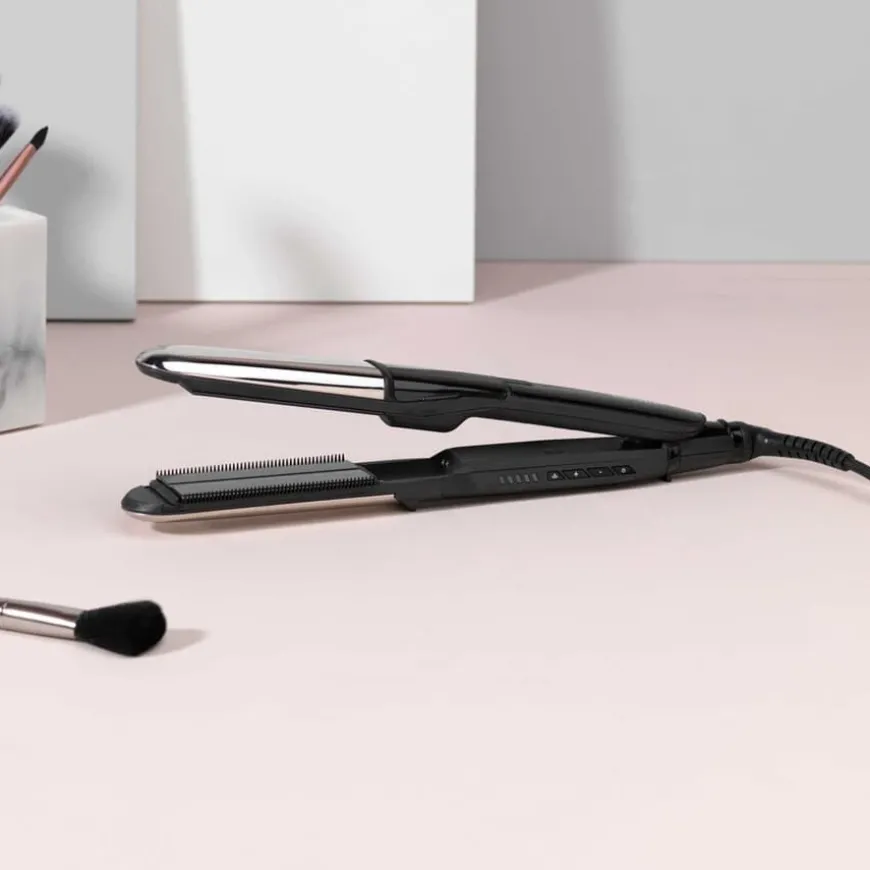 BaByliss Steam Shine Styler er en profesjonell rettetang som frigjør kondisjonerende damp for å fukte og beskytte håret under styling. Denne teknologien bidrar til å opprettholde hårets naturlige fuktighet, redusere krus og etterlate håret ekstra skinnende og mykt.