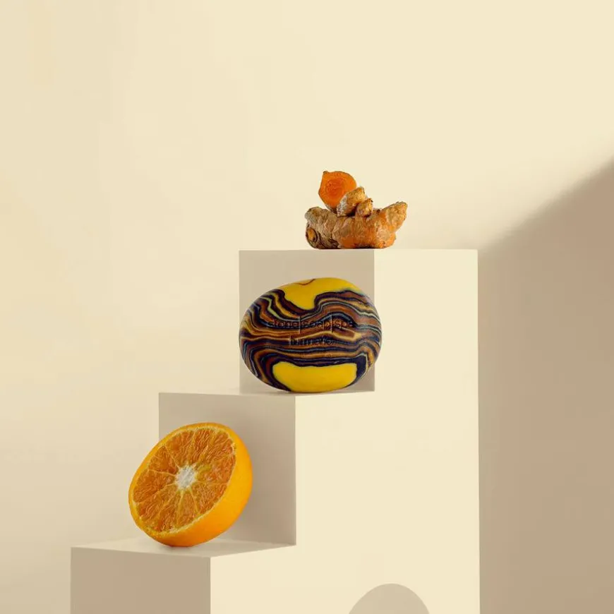 Stone Soap Turmeric er en naturlig håndlaget såpe beriket med den kraftige urten gurkemeie og en søt duft av appelsin. Rik på antioksidanter, er denne såpen ideell for å pleie eksem, psoriasis og dempe pigmentflekker. Den fjerner døde hudceller, gir en sunn og frisk hud, og gjør huden myk og glatt.