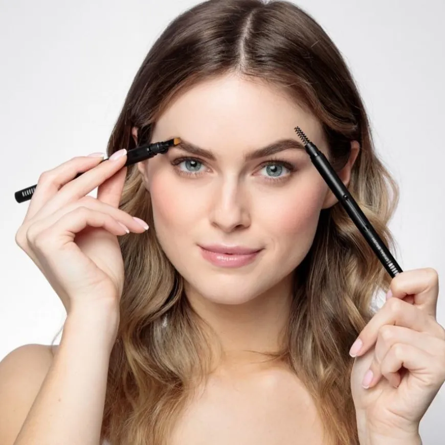 - Om du vil tegne omrisset av hele øyenbrynet kan du ta øyenbrynspomaden og definere øyenbrynet med den tynne siden av kosten.