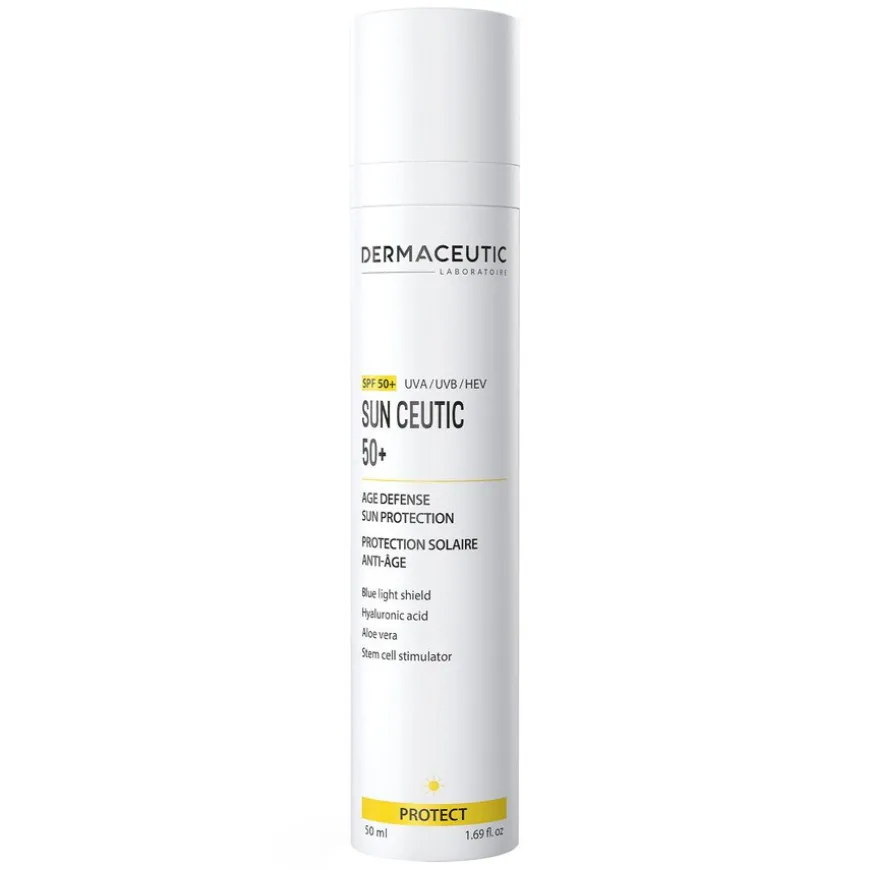 Sun Ceutic 50+ gir bredspektret beskyttelse med SPF 50+ og trippel beskyttelse mot UVA-, UVB- og blått lys (HEV-lys) skader. Den er forsterket med en stamcellestimulator og hyaluronsyre, og gir optimal fuktighet samtidig som den bidrar til å forebygge på tegn på fotoaldring. Huden beskyttes effektivt mot skadelige stråler, dehydrering og forekomsten av mørke flekker og fine linjer.