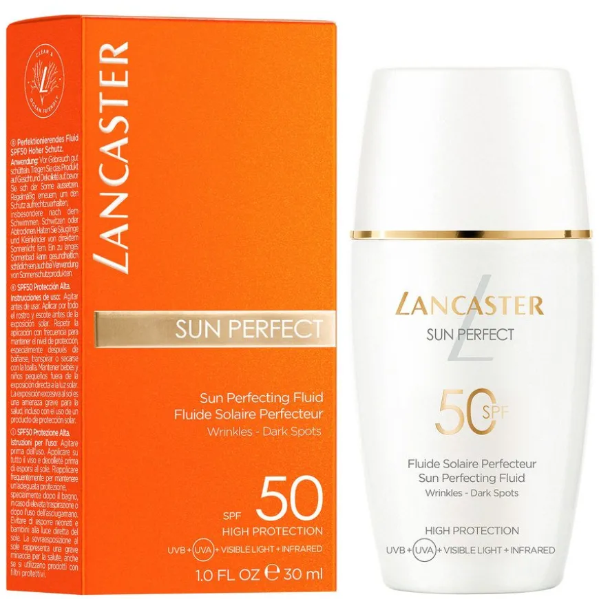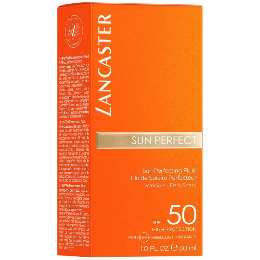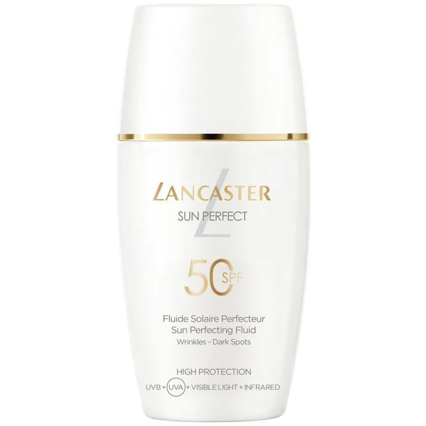 Sun Perfect Sun Perfecting Fluid SPF50 er en lett farget solkrem til ansiktet, som kombinerer hudpleie mot aldringstegn med solbeskyttelse, og kan brukes året rundt. Solkremen er basert på Lancasters eksklusive og avanserte Full Light-teknologi, som beskytter mot 100 prosent av solstrålingen*, samt Lancasters egen antiaging-teknologi, det naturlige Sun Repair-systemet og Glow Booster-komplekset. Sammen gir de huden en bredspektret beskyttelse mot UVB- og UVA-stråling, synlig lys og infrarødt lys, som bidrar til å beskytte huden mot solskader og styrker hudens barriere. Produktet forebygger og korrigerer også rynker, fine linjer og pigmentflekker. I tillegg forbedres hudens fuktighetsinnhold og struktur, noe som fremhever hudens naturlige glød. Huden ser jevnere og mer ungdommelig ut, med en naturlig glød året rundt.