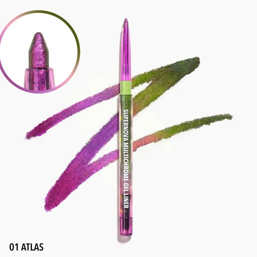 Supernova Multichrome Gel Liner er en eyeliner som lar deg skape fortryllende øyelooks med en unik fargeendrende effekt. Den spesielle blandingen av pigmenter skifter farger avhengig av lysvinkelen, og gir en fantastisk regnbueeffekt som passer til enhver anledning. Den kremete teksturen glir jevnt på huden og tørker raskt til en vanntett, smudge-sikker og overføringsresistent finish. Velg blant livlige nyanser og skap øyeblikk som virkelig gjør et statement!