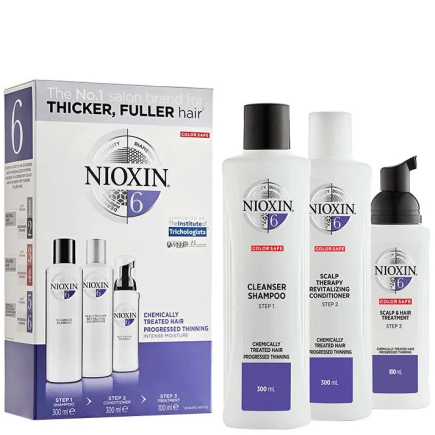 Nioxin® Shampoo: Aqua, Sodium Laureth Sulfate, Sodium Lauryl Sulfate, Cocamidopropyl Betaine, Citric Acid, Sodium Citrate, Sodium Xylenesulfonate, Cocamide Mea, Sodium Benzoate, Sodium Chloride, Salicylic Acid, Polysorbate 20, Propylene Glycol,Mentha Piperita Oil, Mentha Arvensis Leaf Oil, Menthol, Tetrasodium Edta, Trisodium Ethylenediamine Disuccinate, Sodium Hydroxide, Methylparaben, Glycerin, Linoleamidopropyl Pg-Dimonium Chloride Phosphate, Guar Hydroxypropyltrimonium Chloride, Camellia Sinensis Leaf Extract, Hydrolyzed Silk, Tocopheryl Acetate, Biotin, Lecithin, Niacinamide, Panthenol, Aleuritesmoluccana Seed Oil, Foeniculum Vulgare Fruit Extract, Faex Extract, Acer Saccharum Extract, Citrus Limon Peel Extract, Saccharum Officinarum Extract, Vaccinium Myrtillus Leaf Extract, Ci 19140, Ci 17200, Citrus Aurantium Dulcis Fruit Extract, Potassium Sorbate Conditioner: Aqua, Stearyl Alcohol, Cetyl Alcohol, Stearamidopropyl Dimethylamine, Phenoxyethanol, Benzyl Alcohol, Dicetyldimonium Chloride, Glutamic Acid, Bis-Aminopropyl Dimethicone, Propylene Glycol, Methylparaben, Propylparaben,Mentha Piperita Oil, Mentha Arvensis Leaf Oil, Menthol, Edta, Sodium Chloride, Camellia Sinensis Leaf Extract, Polysorbate 20, Biotin, Lecithin, Niacinamide, Panthenol, Tocopheryl Acetate, Foeniculum Vulgare Fruit Extract, Ci 15510, Faex Extract, Acer Saccharum Extract, Citrus Limon Peel Extract, Saccharum Officinarum Extract, Vaccinium Myrtillus Leaf Extract, Hydrolyzed Silk, Citrus Aurantium Dulcis Fruit Extract, Aleuritesmoluccana Seed Oil, Potassium Sorbate, Sodium Benzoate Treatment: Aqua, Phenylbenzimidazole Sulfonic Acid, Niacinamide, Benzophenone-4, Polysorbate 20, Caffeine, Sodium Hydroxide, Benzyl Alcohol, Sodium Benzoate, Phenoxyethanol, Peg-12 Dimethicone, Citric Acid, Cocamidopropyl Betaine, Acetamide Mea, Isopropyl C12-15-Pareth-9 Carboxylate, Tetrasodium Edta, Propylene Glycol, Methyl Nicotinate, Sodium Chloride, Polysorbate 60, Polysorbate 80, Mentha Piperita Oil, Mentha Arvensis Leaf Oil, Menthol, Peg-23M, Camellia Sinensis Leaf Extract, Hydrolyzed Silk, Biotin, Lecithin, Tocopheryl Acetate, Aleurites Moluccana Seed Oil, Foeniculum Vulgare Fruit Extract, Silica, Faex Extract, Acer Saccharum Extract, Citrus Limon Peel Extract, Saccharum Officinarum Extract, Vaccinium Myrtillus Leaf Extract, Citrus Aurantium Dulcis Fruit Extract, Potassium Sorbate