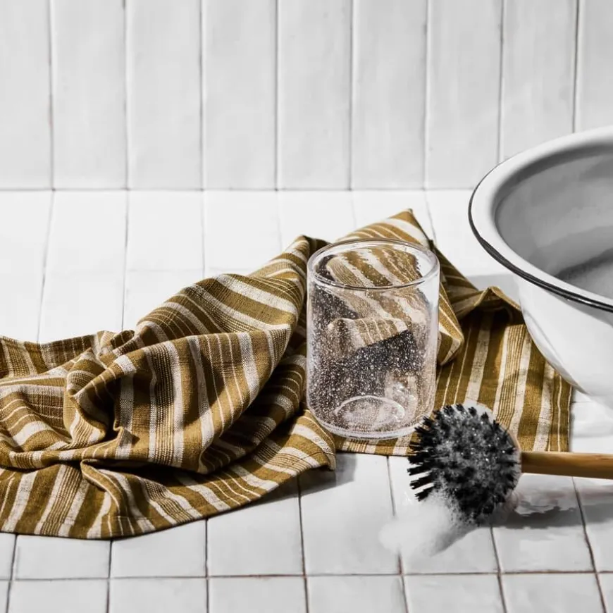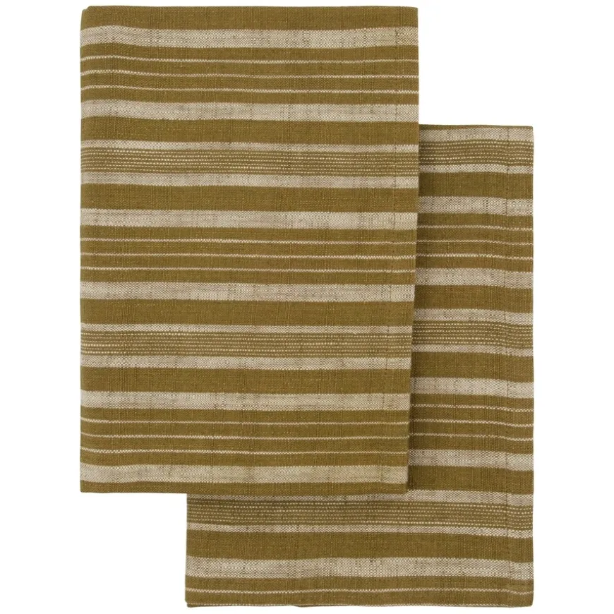 Tea Towels Dark Olive kombinerer funksjonalitet og stil i et sett med to Oeko-Tex-sertifiserte kjøkkenhåndklær. Laget av myk og absorberende bomull, er de ideelle for daglig bruk, enten til tørking av oppvask eller som en dekorativ detalj på kjøkkenet. Den dype, mørke olivenfargen og det klassiske stripete designet tilfører eleganse og en tidløs estetikk til kjøkkeninnredningen din.