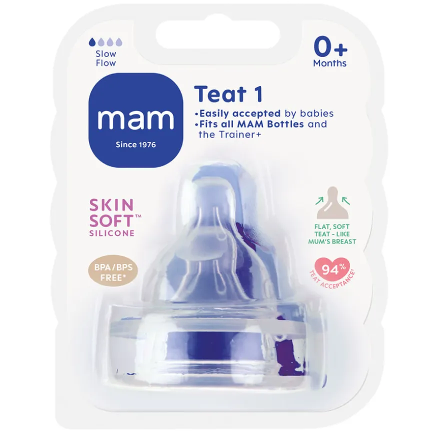 Teat Bottle Pacifier er en flaskesmokk som består av MAM silkesmokk som har en unik silkemyk silikonoverflate. Flaskesmokken er silkebløt og gir assosiasjoner til mors bryst. Smokken har en symmetrisk form som passer perfekt i barnets munn. Flaskesmokken har liten åpning, og passer best til små barn som kun skal ha væske. Flaskesmokken er ventilert som sikrer at barnet mates tilsvarende barnets eget tempo. MAM Teat str. 1 er den minste av flaskesmokkene og passer til MAM tåteflasker. Alle MAMs smokker er symmetriske i formen. Av hygieniske årsaker bør flaskesmokken byttes ut med jevne mellomrom.