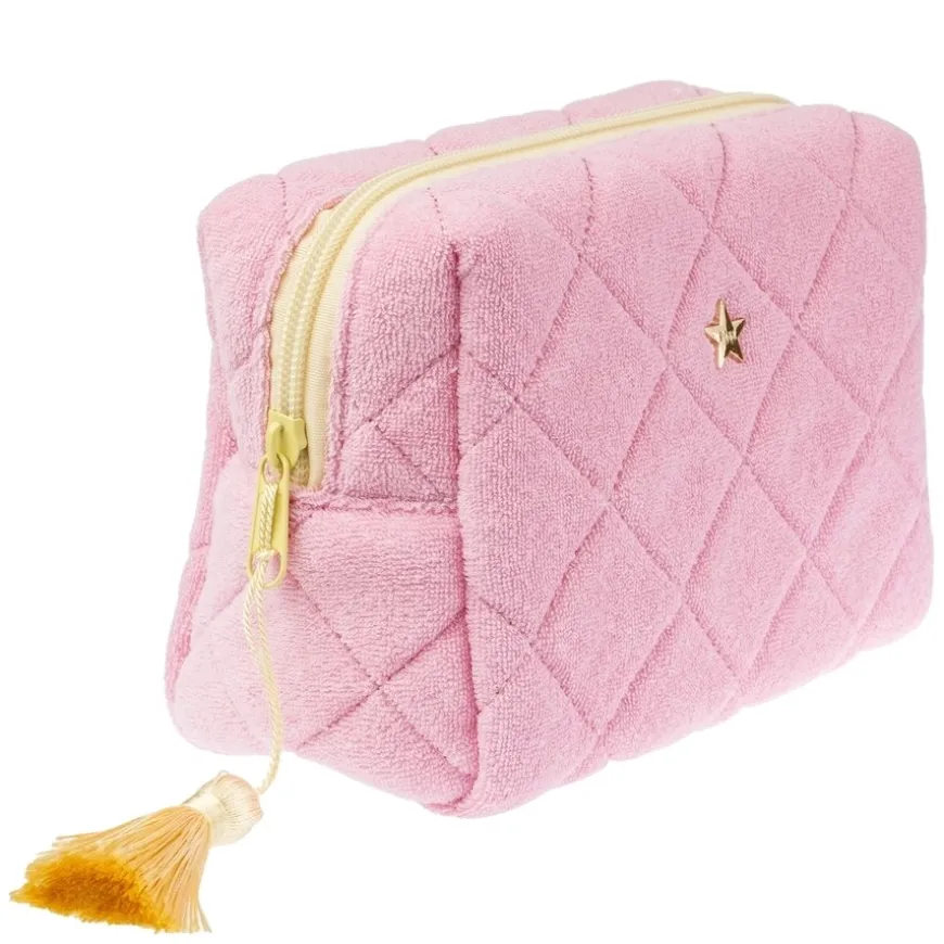 Terry Quilted Make-Up Pouch Small er en kompakt og stilfull sminkepung laget av mykt quiltet frottéstoff. Med en størrelse på 17 x 13 x 6,5–8 cm er den perfekt for oppbevaring av sminke og små nødvendigheter, enten hjemme eller på farten. Den myke teksturen og praktiske størrelsen gjør den ideell for både daglig bruk og reiser.