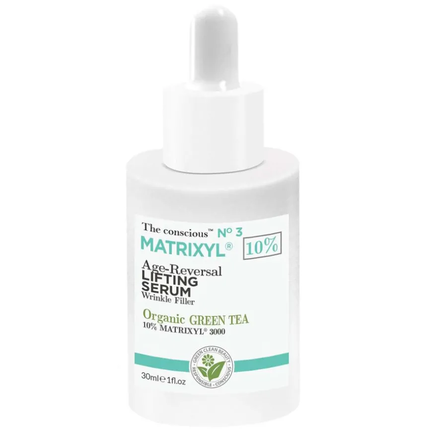 The Conscious Matrixyl Age Reversal Lifting Serum Organic Green Tea er et serum som reduserer statiske og dynamiske rynker, og får huden til å se synlig yngre ut over tid. Produktet er dermatologisk testet, og er en klinisk og naturlig formulering med revitaliserende grønn te fra økologisk landbruk. Matrixyl 3000 er en synergi av to matrikiner, Pal-GHK og Pal-GQPR, som reparerer alderens hudskader. Den inneholder matrikiner som er budbringere for kutan restrukturering og reparasjon. De aktiverer neosyntesen av ekstracellulære matrixmakromekuler og gir serumet en synlig anti-rynkeeffekt.