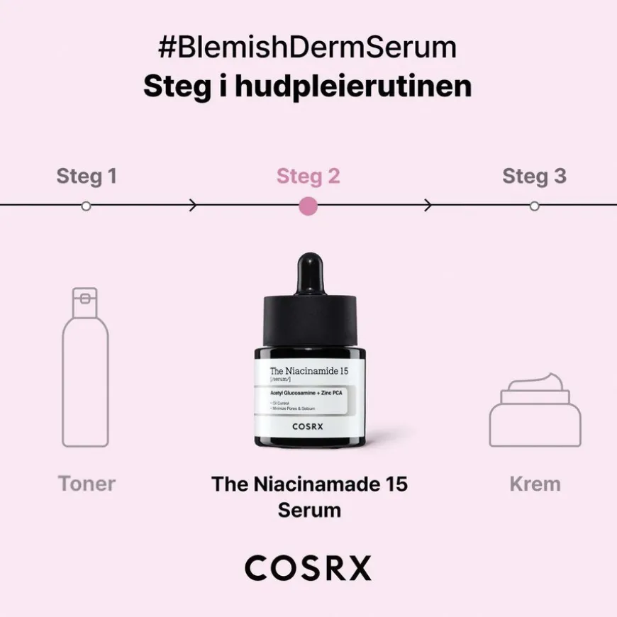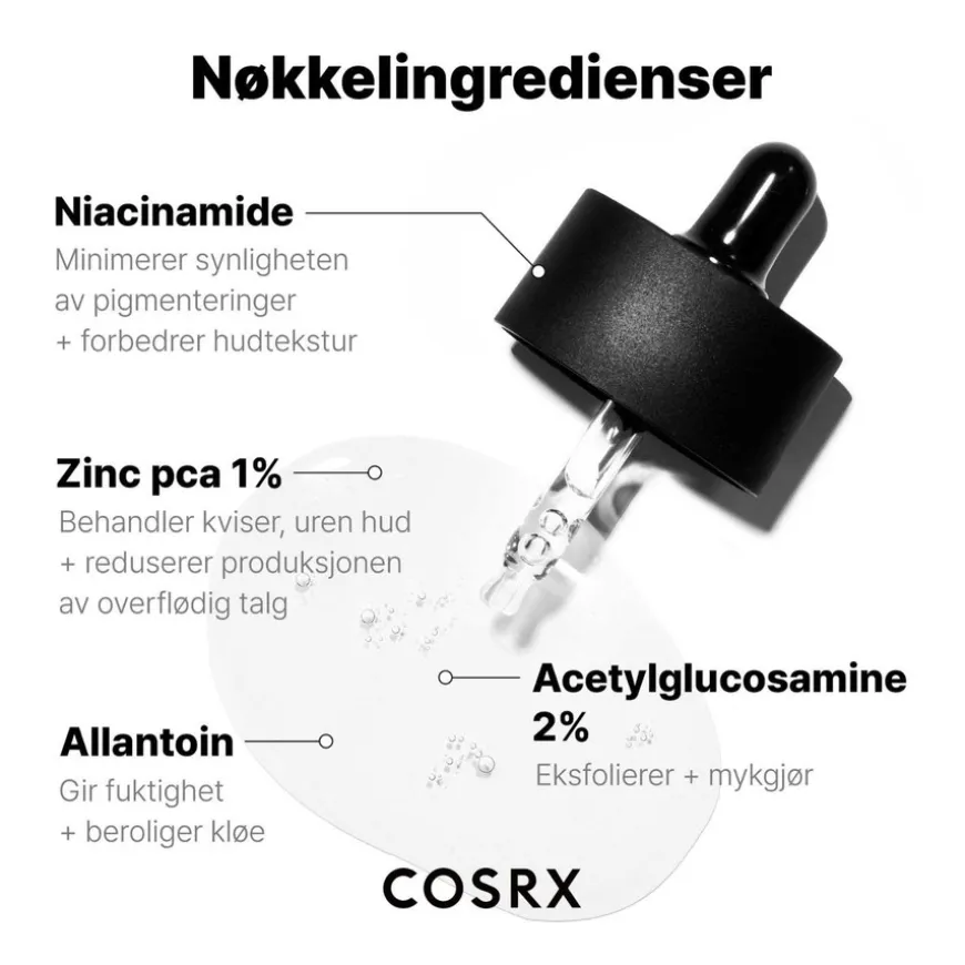 - Zinc Pca 1%: Behandler kviser, uren hud og reduserer produksjonen av overflødig talg.