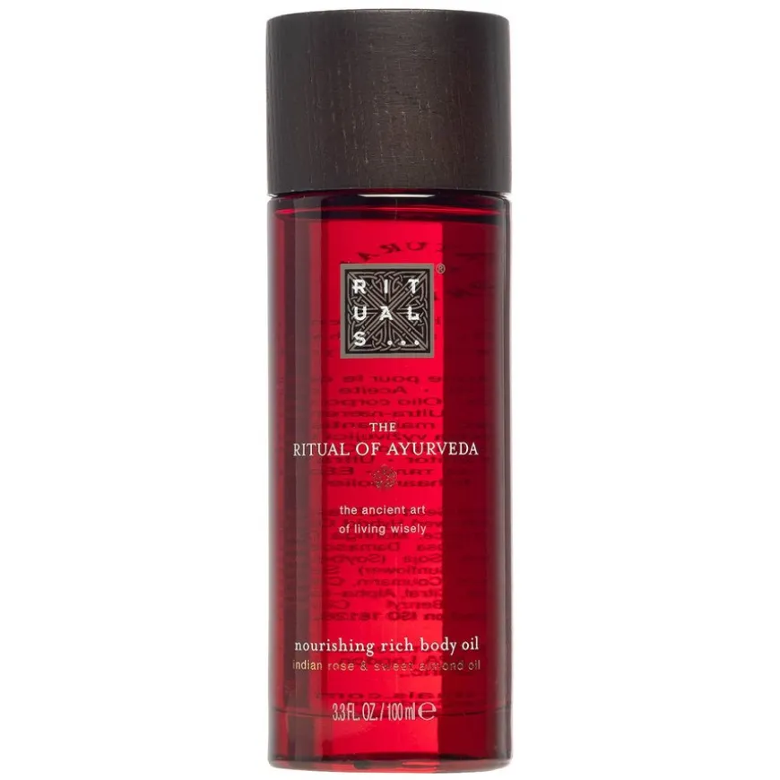 The Ritual Of Ayurveda Rich Body Oil er en rik og nærende kroppsolje med en balanserende duft av indisk rose og mandelolje. Kroppsoljen fukter huden umiddelbart, og den er ekstra god å bruke på tørr hud.