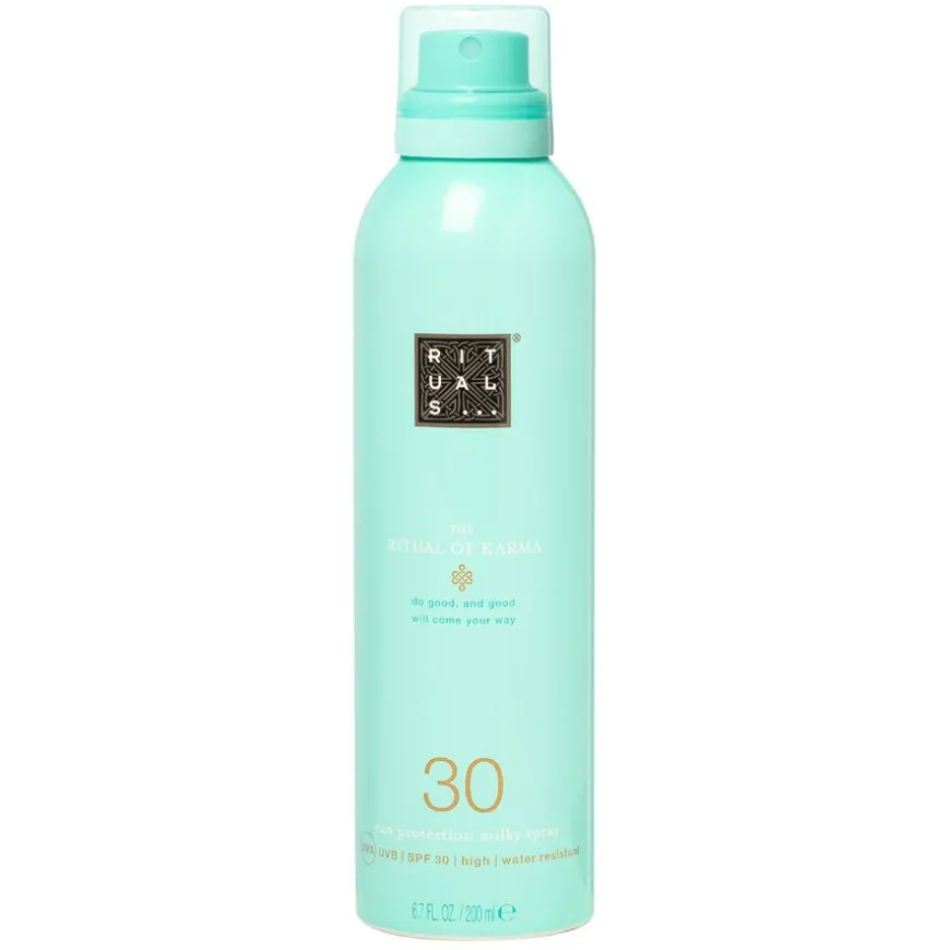 The Ritual Of Karma Sun Protection Milky Spray SPF30 er en solspray med faktor 30 som bekytter mot UVA- og UVB-stråler. Sprayen har en formel som ikke er klissete og absorberes raskt i huden. Formelen er i tillegg vannavstøtende. Dette gjør den perfekt til bruk ved bassenget eller sjøen. Med en søt duft av lotus og hvit te.